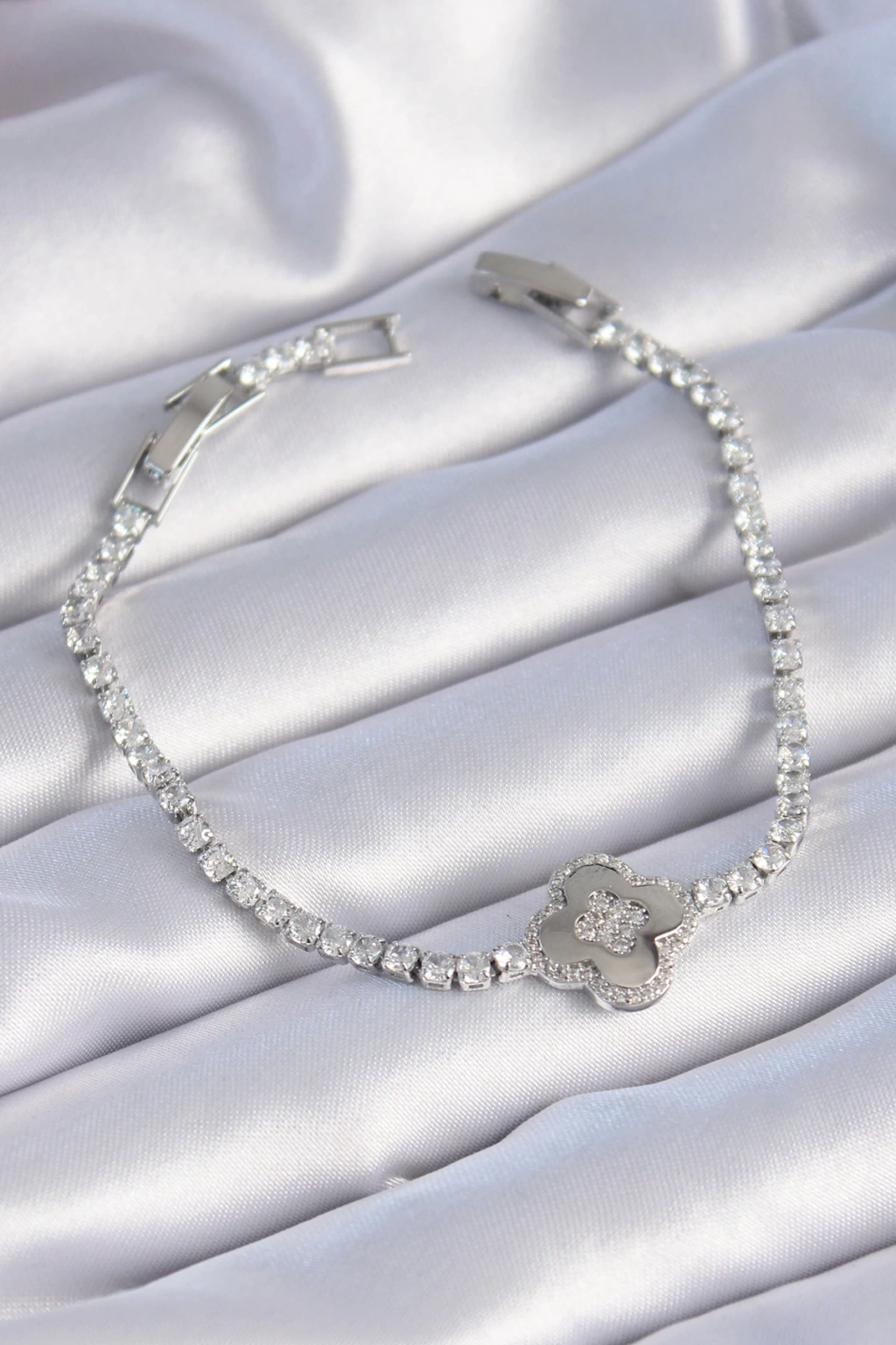 Pirinç Gümüş Renk Zirkon Taşlı Yonca Model Kadın Bileklik - Lisinya